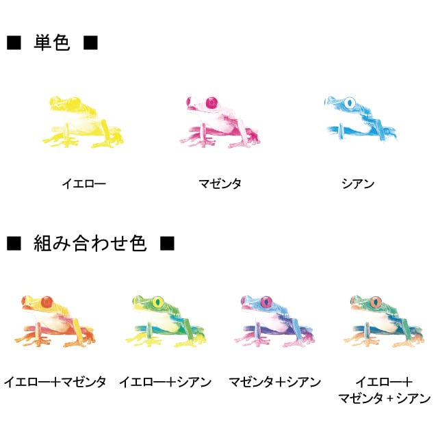 重ね合わせて楽しむスタンプセット。色の三原色の原理で、イエロー、マゼンタ、シアンのスタンプを重ね合わせるとフルカラーに!単色、2色の組み合わせも含め全7色のカラーが楽しめます。浸透印だからスタンプ台なしで連続捺印可能。メモ帳やノートに!いろんなところに押したくなる楽しいスタンプセットです!